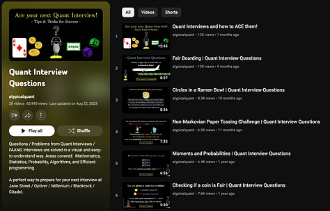 "Quant Interview Questions" playlist by atypicalquant (YouTube) - Valuable insights into quantitative problem-solving scenarios