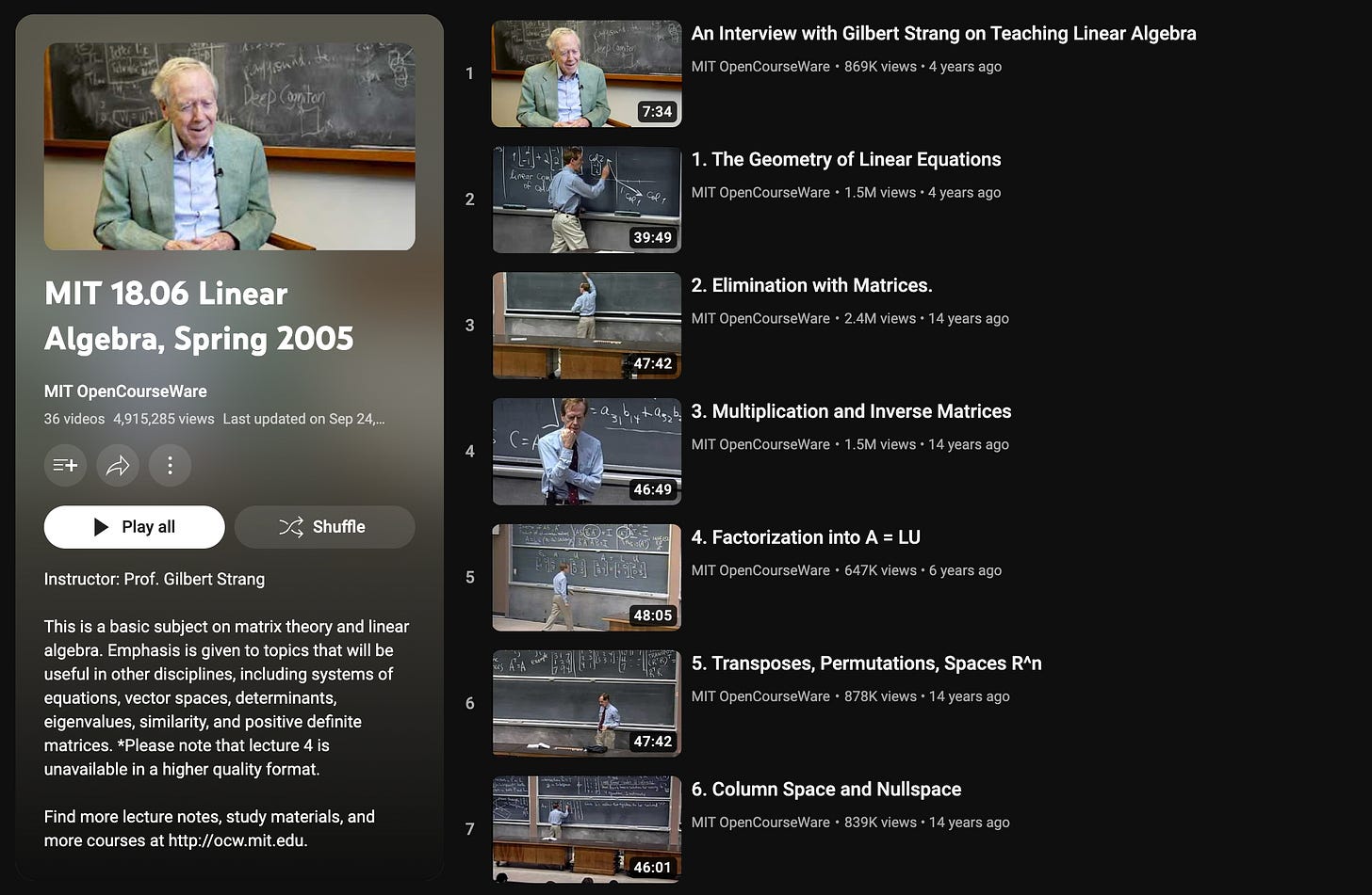 Linear Algebra serves as the backbone for many quantitative roles. Prof. Gilbert Strang's 18.06 MIT Open Courseware is an excellent resource for mastering the fundamentals of Linear Algebra. With clear explanations and comprehensive lectures, this resource provides an in-depth understanding of matrices, vector spaces, and eigenvalues, crucial for quantitative analysis.